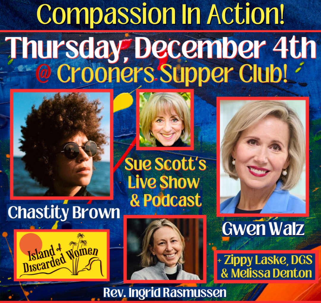 Each show, Sue is joined by a diverse, all-female cast of talented actor/storytellers, passionate singer/songwriters and empowering special guests for “the conversation.” Past special guests have included Civil Rights leaders, Transgender trailblazers, Women’s Rights activists, Award-winning Authors, veteran Journalists and many more!